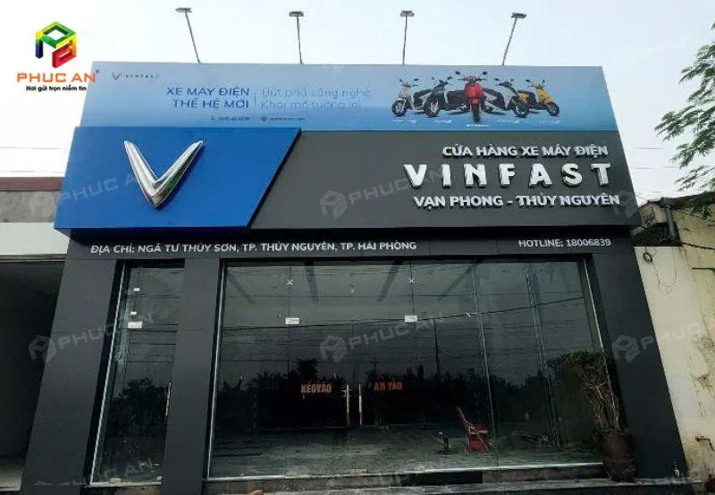 Phúc An thường kết hợp alu với bộ chữ nổi mica, đèn LED hoặc logo hút nổi để tạo nên tổng thể biển quảng cáo sang trọng, hiện đại và đúng chuẩn nhận diện thương hiệu. Các công trình như mặt dựng showroom VinFast đều sử dụng tấm alu màu xanh đậm kết hợp với hệ thống logo mạ crom, tạo hiệu ứng thị giác mạnh, giúp tăng nhận diện thương hiệu từ xa.