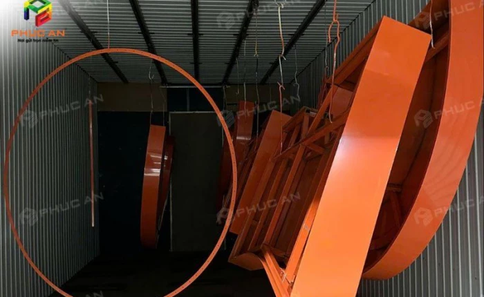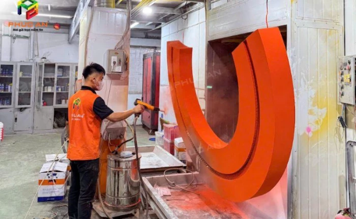 Công nghệ sơn tĩnh điện của Phúc An có thể áp dụng cho các sản phẩm từ sắt, thép, nhôm, inox... phù hợp với khung chữ nổi, khung biển quảng cáo, vật tư kim loại thi công. Phòng sơn được thiết kế với hệ thống hút mùi – lọc bụi chuyên nghiệp, đảm bảo môi trường làm việc an toàn cho công nhân. Đồng thời, quy trình phun sơn tự động giúp lớp sơn phủ đều, không bong tróc, không lem màu và tăng độ bền cho sản phẩm.